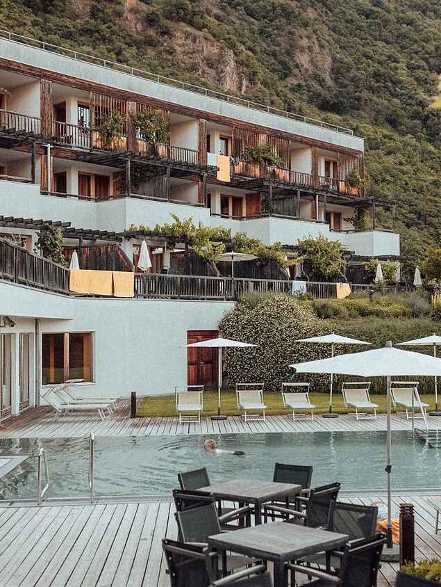 In unserem Bio-Wellnesshotel in Südtirol könnt Ihr nicht nur reinstes Wasser trinken, sondern Euch auch ganz frei darin bewegen, in unserem plastikfreien Innen- und Außenpool.
