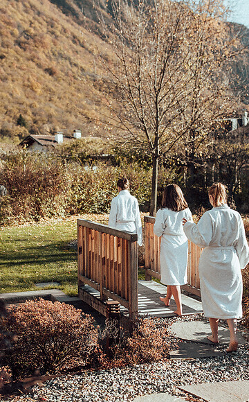 At our day spa near Merano and Bolzano, the entire wellness area is also open to day guests. This includes the connected indoor and outdoor pool (12 m and 17 m respectively), the spacious garden, the fitness room including outdoor training equipment, the sauna area with Finnish sauna, bio sauna and steam bath, as well as the Kneipp facility. If you would like to complement your day with a massage or treatment, we are happy to advise you in advance by phone or email.